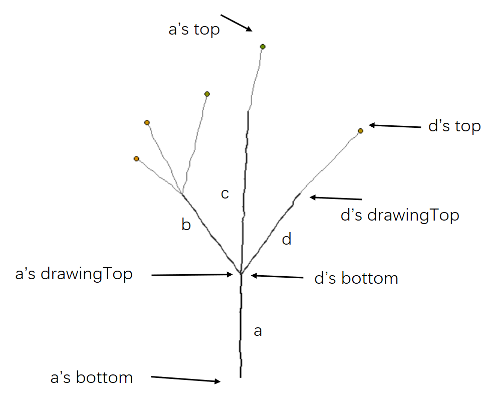 drawingTop定义为该节点自身(不含其子孙)的描绘用“上”顶点。a节点在树中的实际表现为一段树支,树支的描绘范围即为bottom至drawingTop点。从drawingTop一直到top则是a的子孙们的描绘区域。下图中,b,c,d为a的儿子,b,c,d也是TreeNode类型,其bottom应等于a的drawingTop。