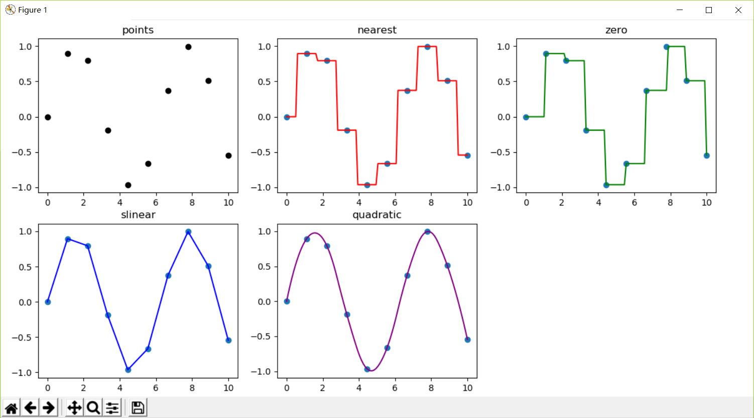 上述代码的绘图结果见上图中的nearest, zero, slinear, quadratic子图。