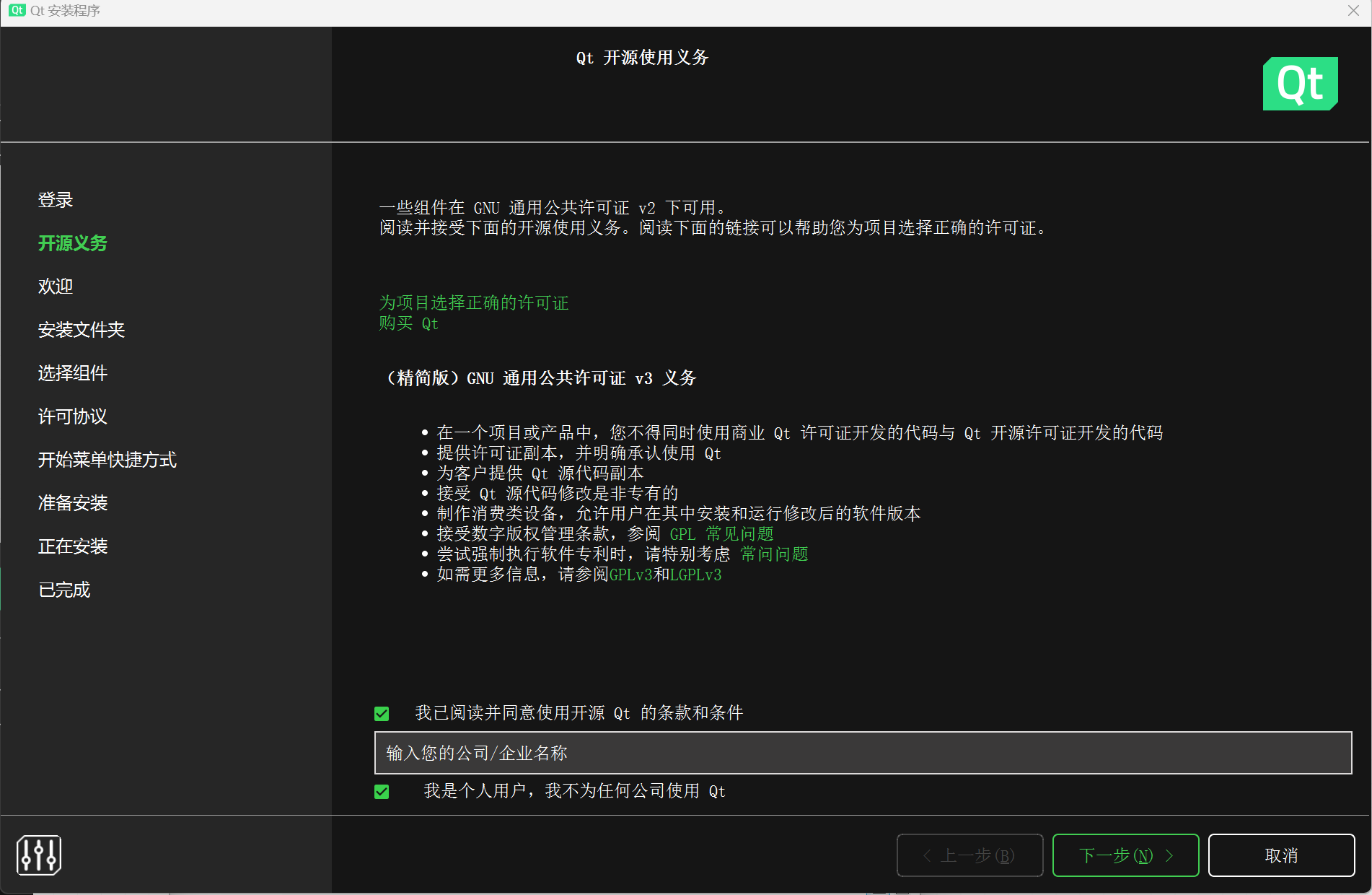 此时Qt安装器将被打开,你可以按照下文所述的正常步骤进行安装