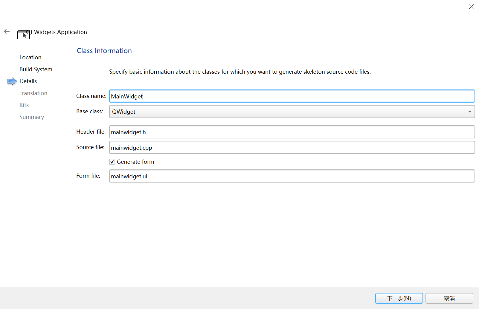 在接下来的Class Information(类信息)对话框中,将Base class(基类)调整为QWidget,并将Class name(类名)修改为MainWidget,然后点击下一步。QWidget是Qt中表示窗口的类型。