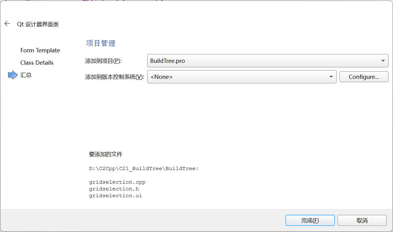 回到项目结构树,会发现项目中增加了三个文件,分别是:gridselection.ui, gridselection.h以及gridselection.cpp。