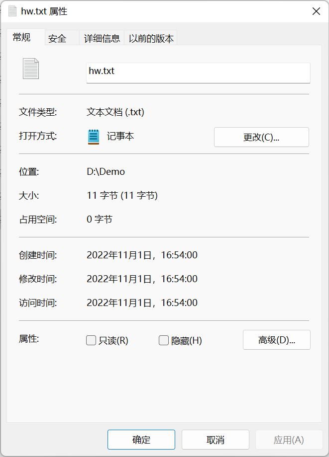 查看hw.txt的文件属性,可见该文件事实上占据了11个字节的空间。
