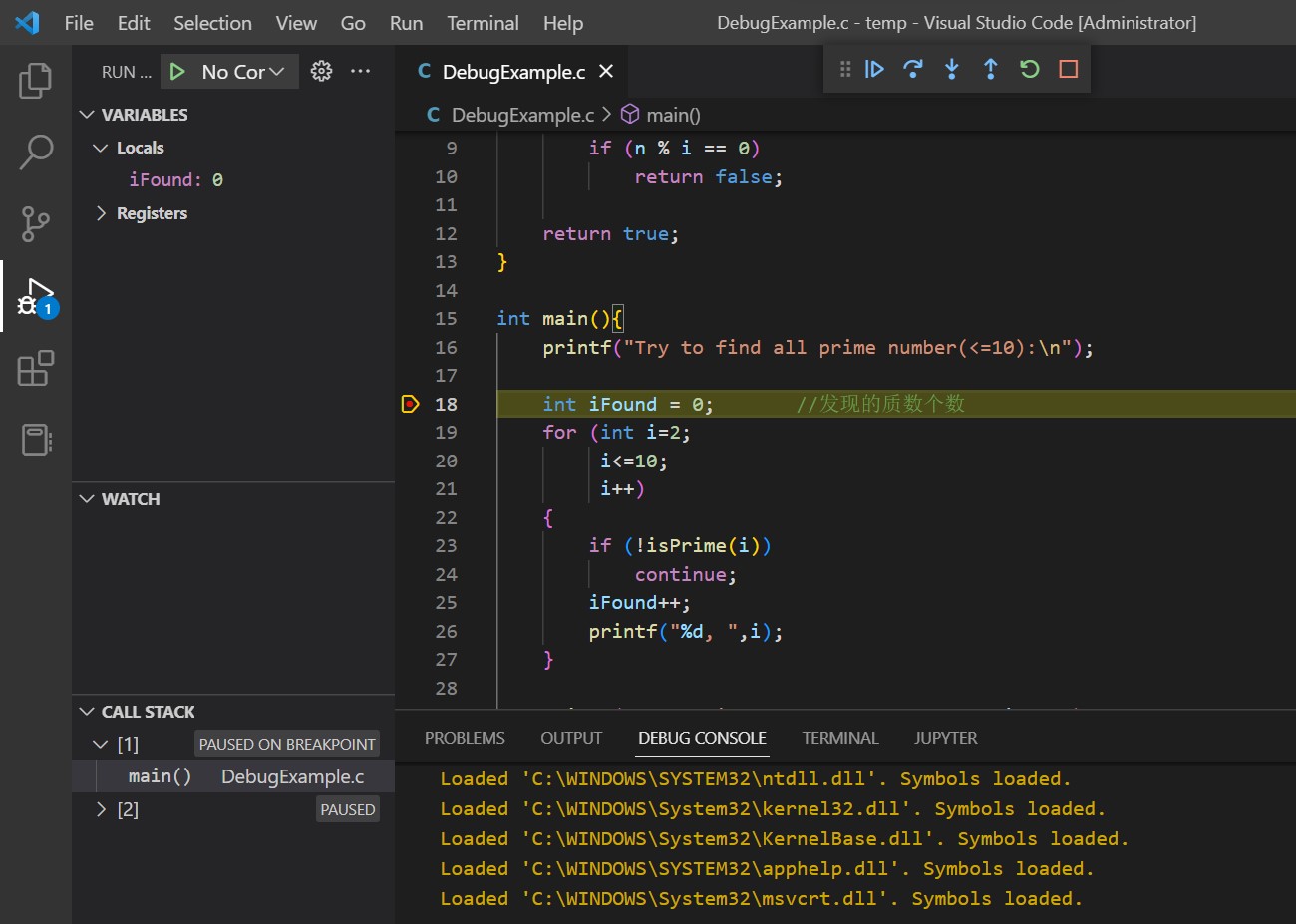 再次按Step Into后,第25行被执行,iFound由0变1,黄色箭头指向第26行。