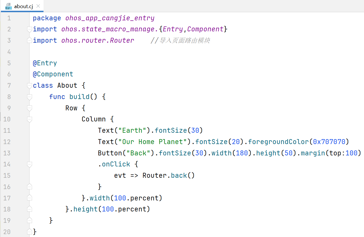 ▶第3行:ohos.router.Router为界面路由包。其提供一系列函数支持终端屏幕上的页面切换和跳转。